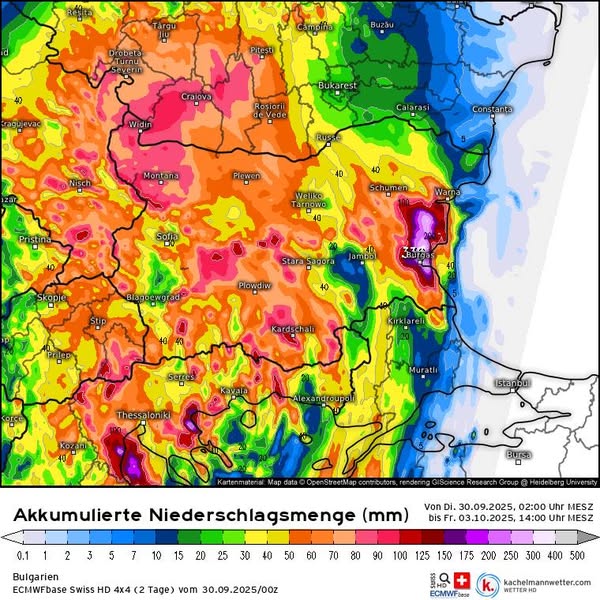 В четвъртък и петък (2 и 3 октомври) се очакват повсеместни и интензивни валежи, на места с количества далеч над нормите. Най-критично се очертава положението във Варненско и Бургаско – прогнозират се 200–300 литра на квадратен метър за около 48 часа.