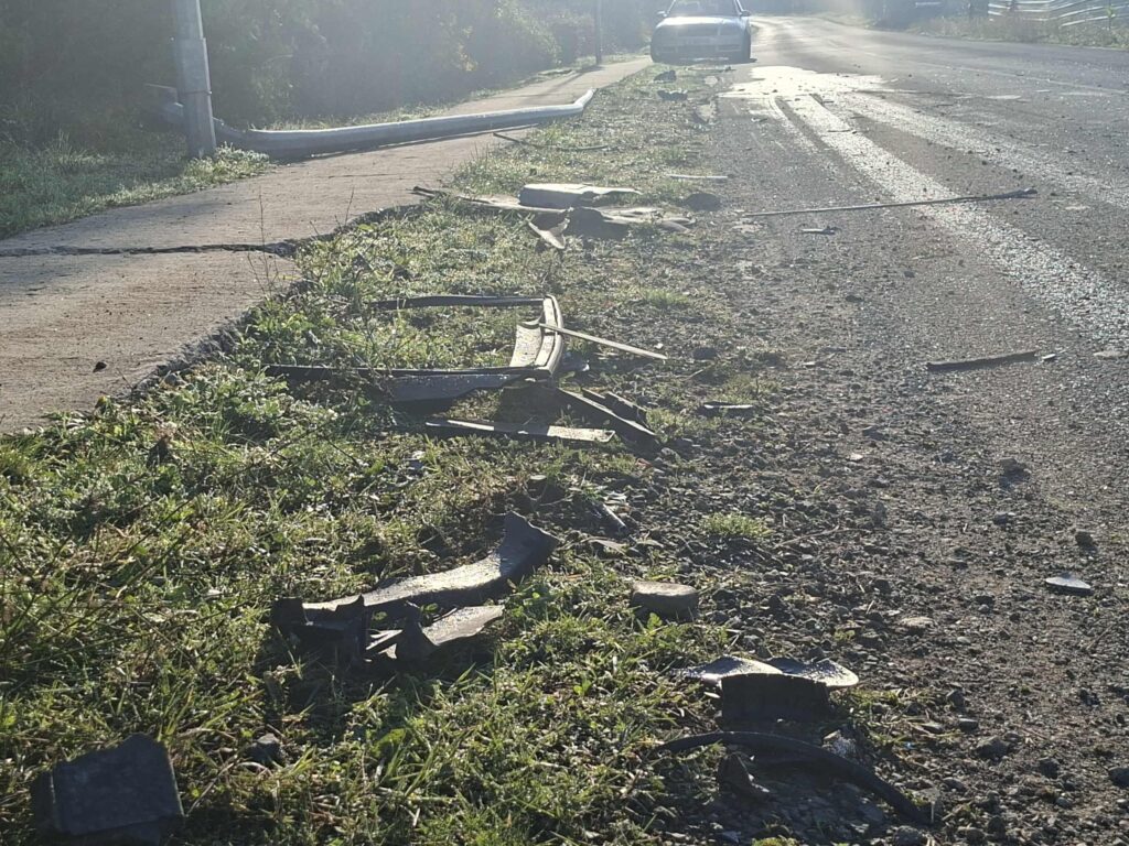 Лек автомобил „Ford S-Max“ с украинска регистрация се е движил с несъобразена скорост. При навлизане в десен завой водачът губи контрол, колата се удря в скален откос, след което се завърта и се блъска с мощен удар в метален стълб от уличното осветление!