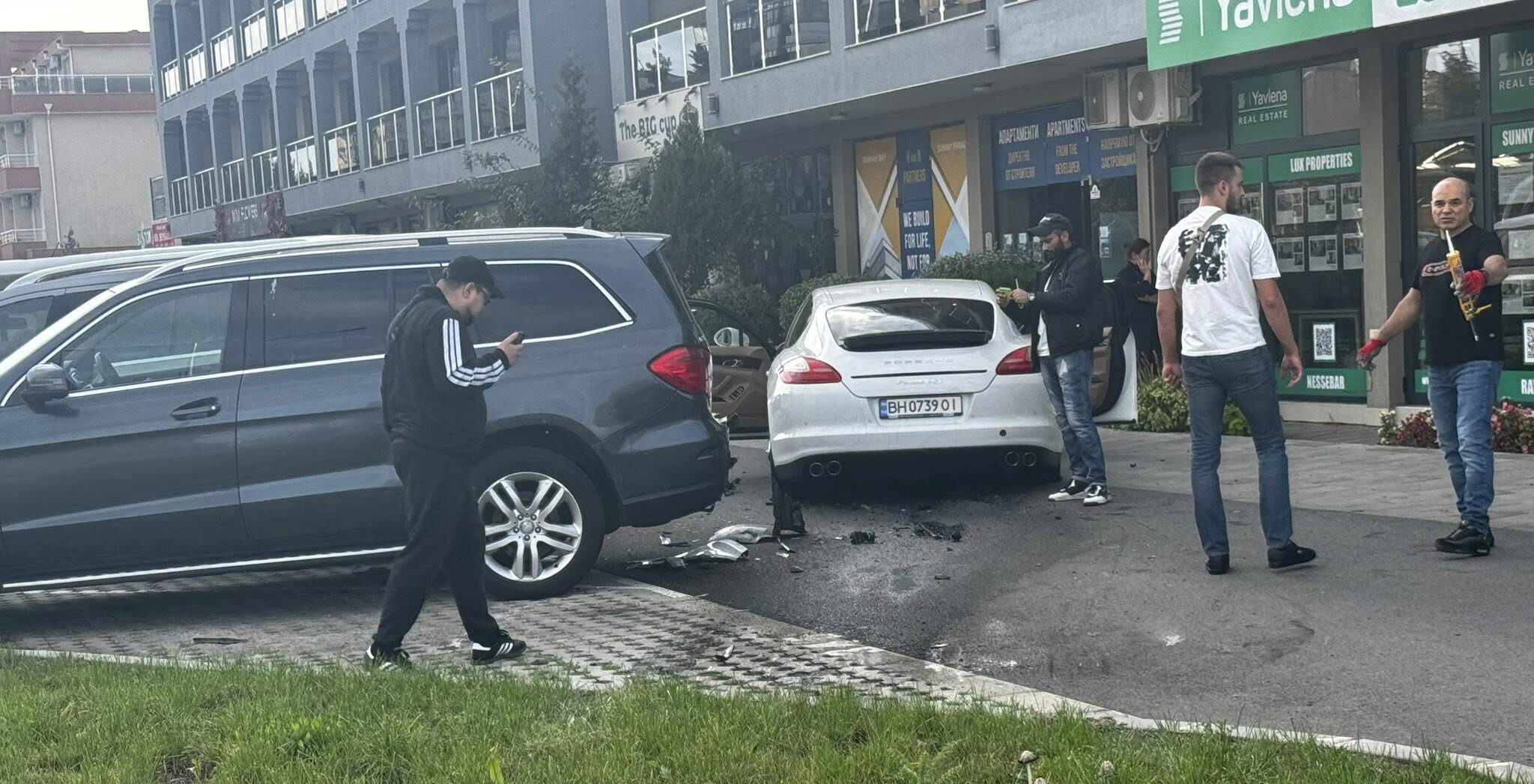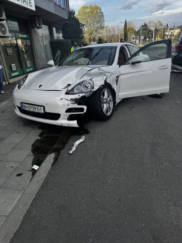 За щастие няма пострадали хора. Щетите са само материални — по Porsche-то са нанесени сериозни поражения в предната част, а други два автомобила са видимо ударени в задната си част.