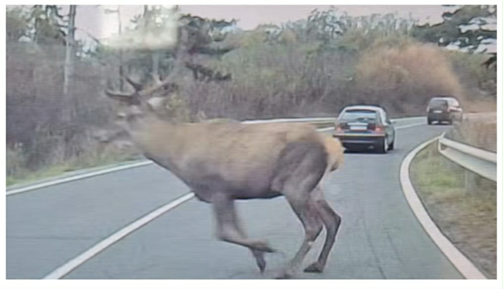 На видеорегистраторите ясно се вижда как красивият екземпляр спокойно пресича пътното платно, без да проявява страх от автомобилите. Шофьорите са успели да реагират навреме и да спрат, като така са избегнали инцидент.