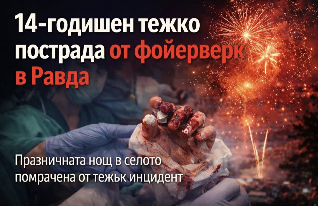 Новогодишната нощ в село Равда беше помрачена от тежък инцидент, при който 14-годишно момче пострада сериозно след възпламеняване на фойерверк, съобщиха от ОДМВР–Бургас.