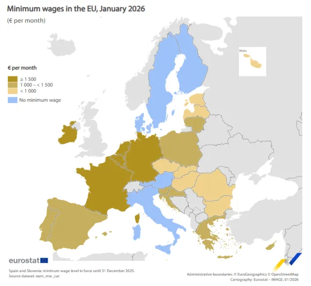 Най-високи минимални заплати се отчитат в шест западноевропейски държави. Франция е с 1823 евро, Белгия — с 2112 евро, а Нидерландия и Германия съответно с 2295 и 2343 евро. Още по-високи са минималните възнаграждения в Ирландия — 2391 евро, и Люксембург, който остава лидер с 2704 евро месечно.